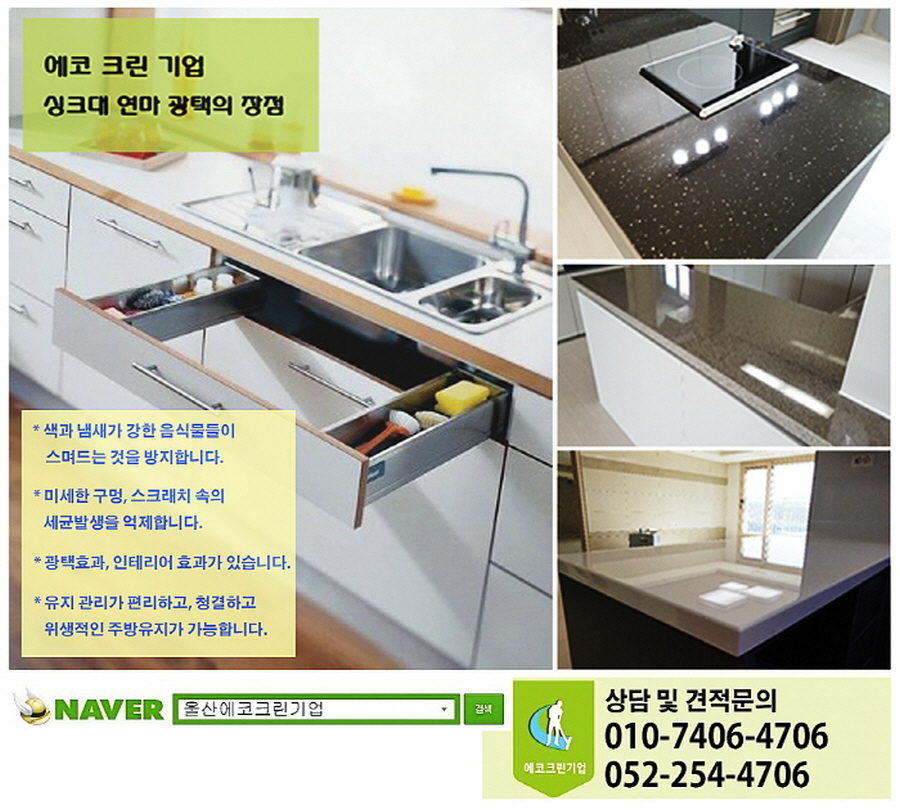 저희 울산에코크린기업은 청소와 광택/줄눈등 토탈전문업체입니다. 남,녀 혼합팀 3∼5분이 함께 하루 한집만을 고집하며 청소를 하고 있습니다. 입주청소/이사청소/줄눈/씽크상판연마광택/마루코팅/새집증후군제거/보일러배관청소/공장청소/학원/사무실/학교/상가/ 리모델링후청소/건물유지관리/세탁기청소/에어컨청소/원룸관리/철거/생활폐기물처리/정기청소/준공청소 등 청소와 광택등 관리가 가능하답니다. 청소와 광택에 관한한 모든 장비를 대여가 아닌 직접 보유하고 있어 적재적소에 맞는 장비와 친환경 약품을 사용하며 고객과의 시간약속을 엄수하여 만족도를 한껏 높여드립니다. 또한 토요일/일요일/공휴일 관계없이 평일과 동일한 견적가로 모든 시공을 받으실 수 있습니다. 정직과 신뢰를 바탕으로 더욱 더 열심히 하는 울산에코크린기업이 되겠습니다. 감사합니다. 연락처;052-254-4706 H.P ; 010-7406-4706 www.ulsaneco.co.kr http://blog.ulsaneco.co.kr
