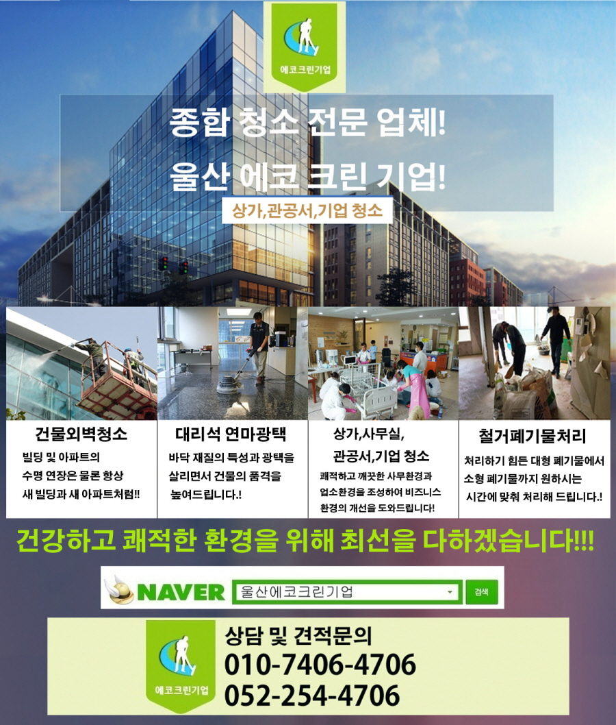 저희 울산에코크린기업은 청소와 광택/줄눈등 토탈전문업체입니다. 남,녀 혼합팀 3∼5분이 함께 하루 한집만을 고집하며 청소를 하고 있습니다. 입주청소/이사청소/줄눈/씽크상판연마광택/마루코팅/새집증후군제거/보일러배관청소/공장청소/학원/사무실/학교/상가/ 리모델링후청소/건물유지관리/세탁기청소/에어컨청소/원룸관리/철거/생활폐기물처리/정기청소/준공청소 등 청소와 광택등 관리가 가능하답니다. 청소와 광택에 관한한 모든 장비를 대여가 아닌 직접 보유하고 있어 적재적소에 맞는 장비와 친환경 약품을 사용하며 고객과의 시간약속을 엄수하여 만족도를 한껏 높여드립니다. 또한 토요일/일요일/공휴일 관계없이 평일과 동일한 견적가로 모든 시공을 받으실 수 있습니다. 정직과 신뢰를 바탕으로 더욱 더 열심히 하는 울산에코크린기업이 되겠습니다. 감사합니다. 연락처;052-254-4706 H.P ; 010-7406-4706 www.ulsaneco.co.kr http://blog.ulsaneco.co.kr
