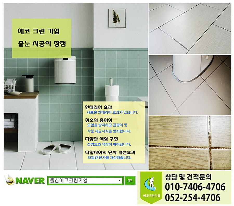 안녕하세요, 울산에코크린기업입니다. 저희 울산에코크린기업은 청소와 광택/줄눈등 토탈전문업체입니다. 남,녀 혼합팀 3∼5분이 함께 하루 한집만을 고집하며 청소를 하고 있습니다. 입주청소/이사청소/줄눈/씽크상판연마광택/마루코팅/새집증후군제거/보일러배관청소/공장청소/학원/사무실/학교/상가/리모델링후청소/건물유지관리/세탁기청소/에어컨청소/원룸관리/철거/생활폐기물처리/정기청소/준공청소 등 청소와 광택등 관리가 가능하답니다. 청소와 광택에 관한한 모든 장비를 대여가 아닌 직접 보유하고 있어 적재적소에 맞는 장비와 친환경 약품을 사용하며 고객과의 시간약속을 엄수하여 만족도를 한껏 높여드립니다. 또한 토요일/일요일/공휴일 관계없이 평일과 동일한 견적가로 모든 시공을 받으실 수 있습니다. <여름맞이 할인이벤트> *씽크상판연마광택:신축 10만원 / 구축 15만원 *줄눈시공(욕실1실당):신축 8만원 / 구축 13만원 *마루코팅(평당) 신축 5천원 / 구축 7춴원 *에어컨 2in1 기준 15만원 *통돌이세탁기 10kg 기준 8만원 *수도배관청소 10만원 정직과 신뢰를 바탕으로 더욱 더 열심히 하는 울산에코크린기업이 되겠습니다. 감사합니다. 연락처;052-254-4706 H.P ; 010-7406-4706 www.ulsaneco.co.kr http://blog.ulsaneco.co.kr